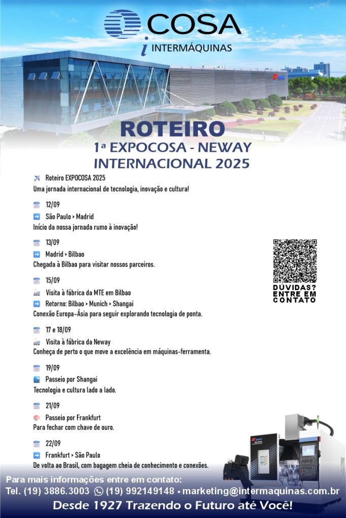 A 1ª ExpoCOSA Internacional 2025 não é apenas um roteiro de visitas. É uma ponte para o futuro, uma oportunidade de vivenciar de perto as tecnologias que movem o setor, estreitar parcerias estratégicas e trazer ao Brasil o que há de mais moderno em máquinas-ferramenta.